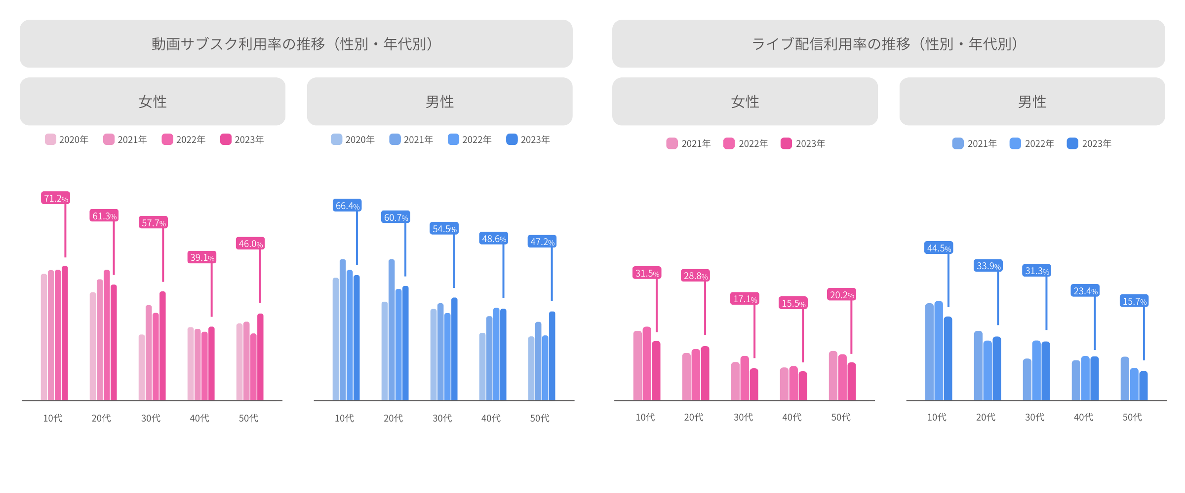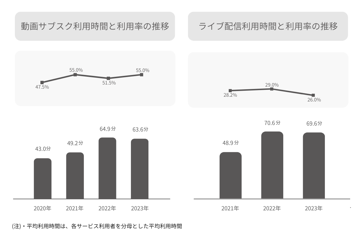 動画サブスクの利用率は2022年に一時的に低下したが、2023年には55.0%と2021年水準に戻った。ライブ配信の利用率は、2022年の29.0%から2023年の26.0%と3.0ポイント減少している。