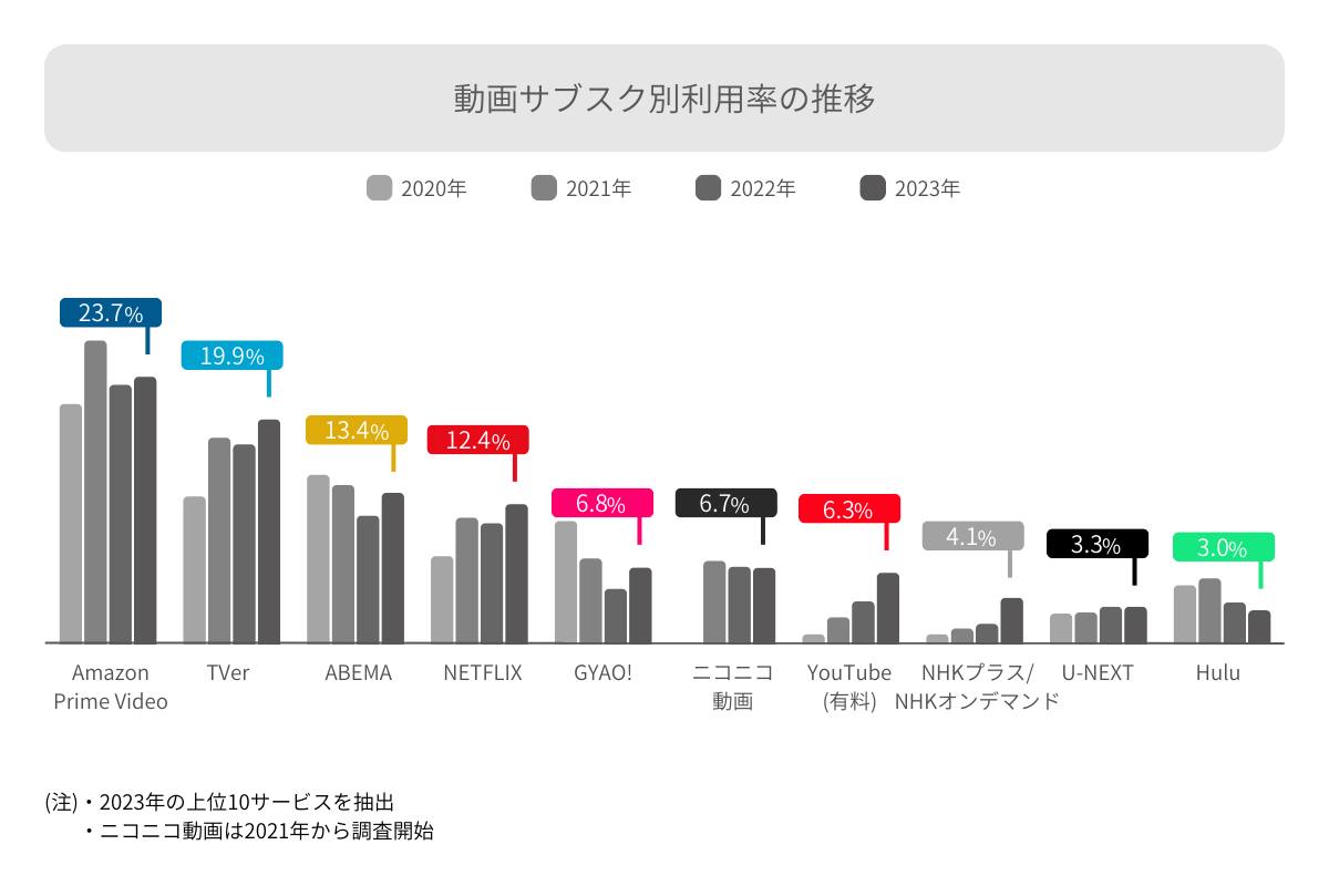動画サブスクは「AmazonPrimeVideo」、「TVer(ティーバー)」、「ABEMA(アベマ)※旧AbemaTV」、「NETFLIX(ネットフリックス)」などの上位利用率のサービスがさらに利用率を伸ばした。「NHKオンデマンド/NHKプラス」や「YouTube(ユーチューブ)有料」も2020年に調査を開始して以来、大幅に利用率を伸ばしている。今後も利用率の上昇が見込まれる。