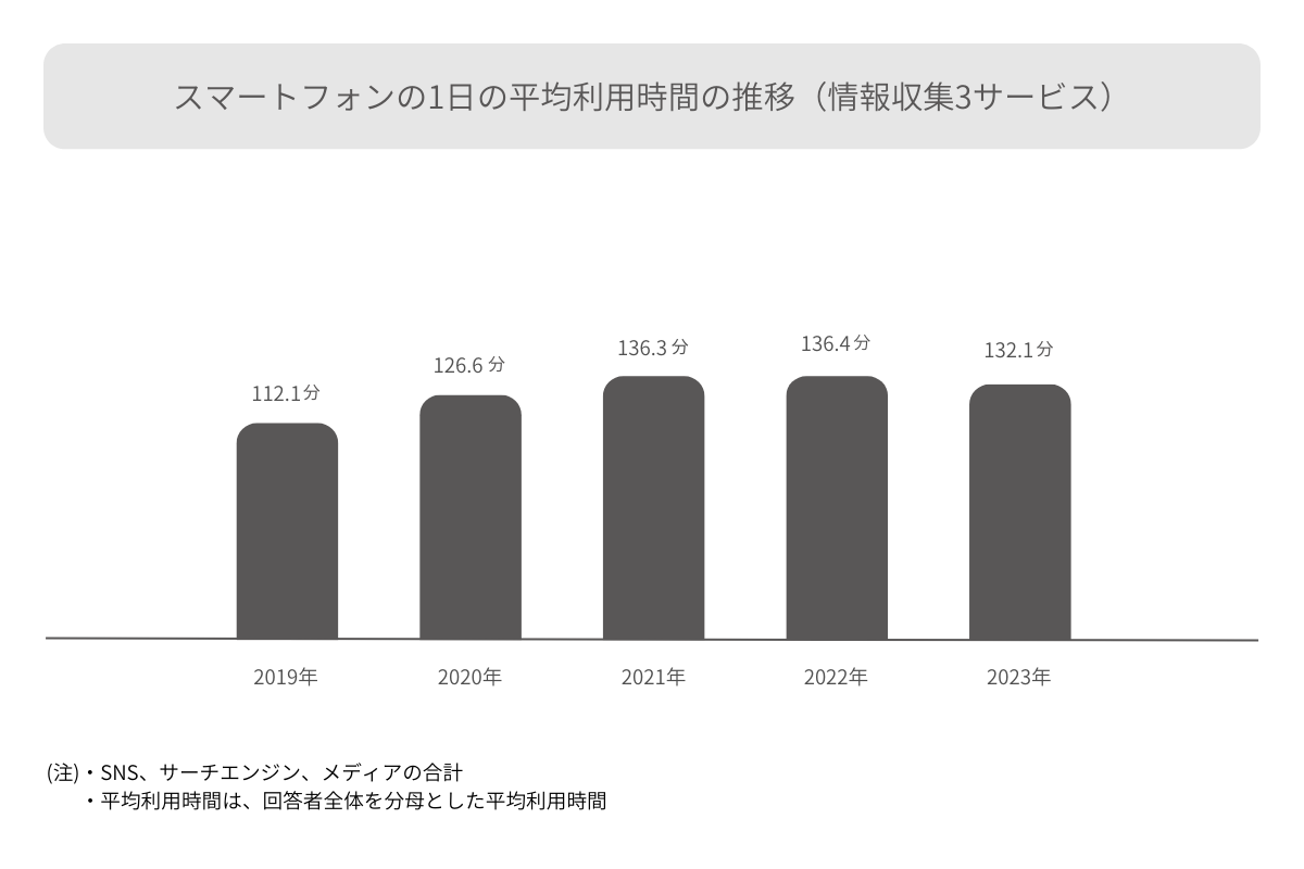 「SNS」、「サーチエンジン」、「メディア」、「動画サブスク」、「ライブ配信」のそれぞれの利用状況を見ると、「ライブ配信」を除く各サービスは2022年と比較し利用率が上昇している。スマートフォンで情報収集に費やす総利用時間が減少し、各サービス間で利用可能な時間が競合している可能性を示している。各サービスはより高いタイムパフォーマンス(時間効率)を提供する必要があると考えられる。