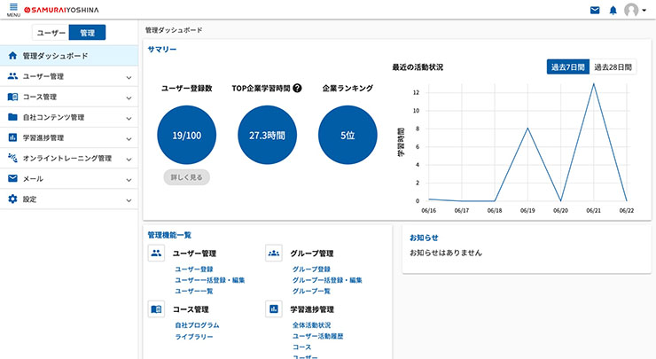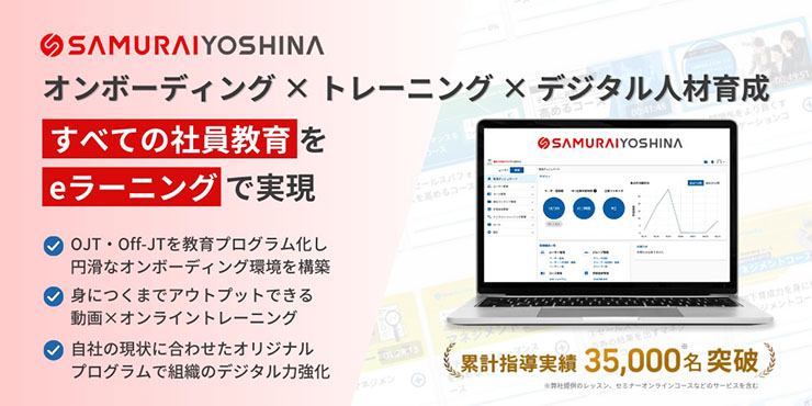 「SAMURAI YOSHINA」はオンボーディング、OJT、集団研修、自宅学習、デジタル人材育成などの社員教育を「eラーニング」で実現するサービス。研修の質の均一化と研修コストの軽減を図り、効率的な教育環境の提供が可能となる。