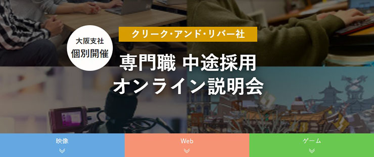 株式会社クリーク・アンド・リバー社(C&R社)の大阪支社は6月28日、「専門職中途採用オンライン説明会」を開催すると発表した。クリエイティブ業界に関心を持つ転職者や未経験者を対象に実施する。オンライン形式で、日時は7月3日から31日まで、平日10:00~20:00で行われる。