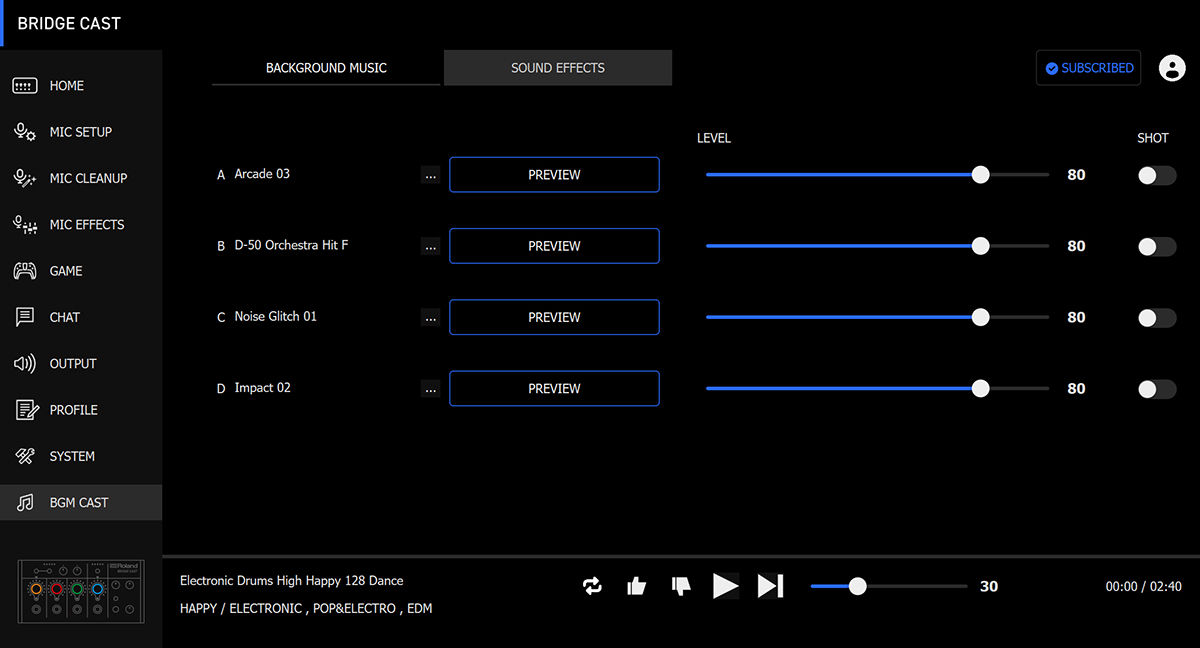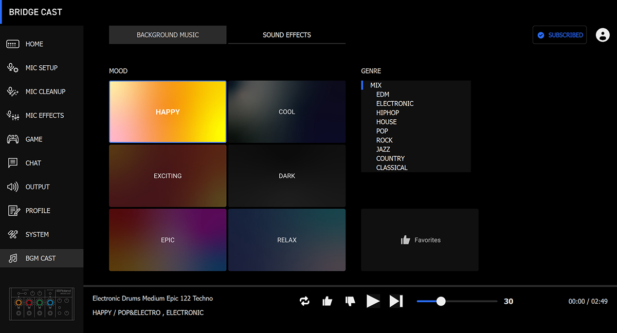 ローランド株式会社は、「Roland Cloud」で、著作権フリーのBGMや効果音を提供するサービス「BGM CAST」を開始した。2023年1月に発売されたオーディオミキサー「BRIDGE CAST」に対応し、今後はほかの同社製品でも対応が予定されている。