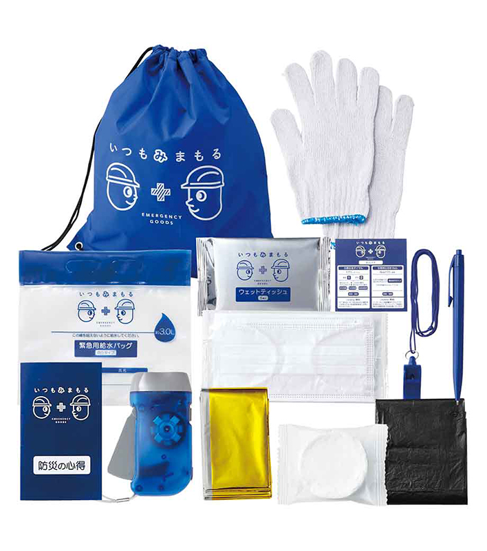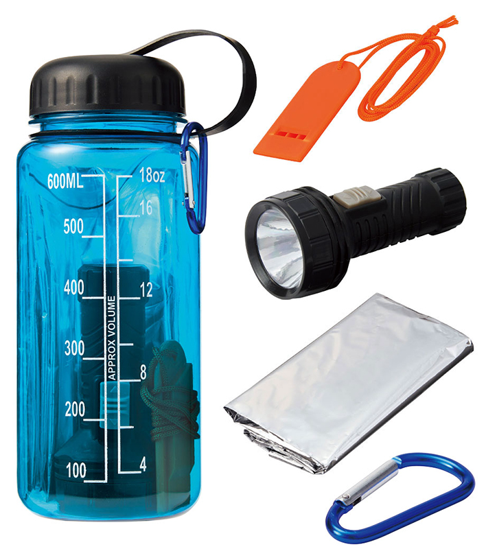 中身が見えるウォーターボトルに、容器を含めて5点のアイテムを同梱。カラビナキーホルダー、ライト、薄型ホイッスル、アルミブランケットが含まれている。保管しやすく、災害時に簡単に持ち出せる形態であることが特徴。家庭や職場はもちろん、車の中にも備えておきやすい。1色印刷に対応。