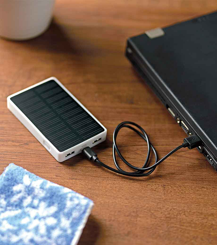 緊急時に電源が確保できないときに重宝するアイテム。本体の裏面がソーラーパネルとなっており、太陽光で蓄電できる。災害時はもちろん、普段のアウトドアのシーンなどでも使いやすい。バッテリー容量は5,000mAh。シルク、パッドの1色もしくは2色、またはフルカラーで大きく名入れができるため、記念品にも適している。
