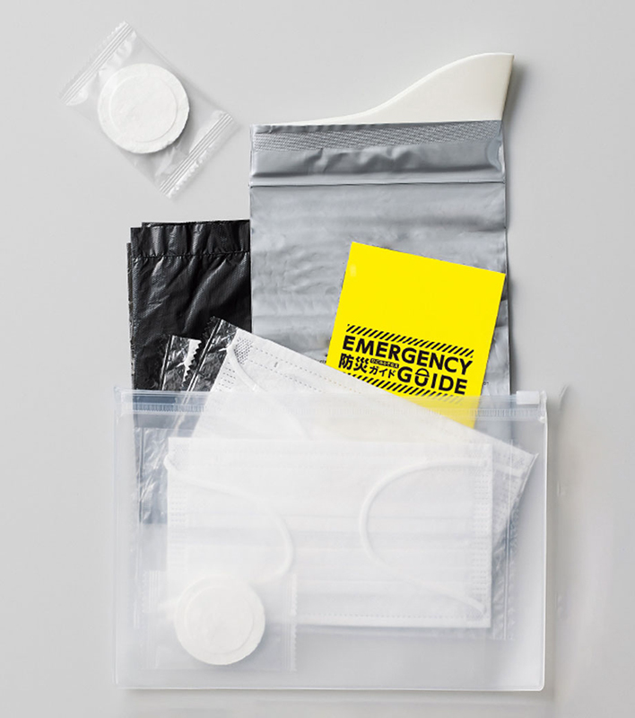 衛生面に特化した商品を集めているポーチ型の6点セット。携帯トイレ、圧縮タオル、ごみ袋に加え、防災ガイドやマスクも含まれている。ポーチは単行本ほどの大きさで、軽くて持ち運びやすい。1色印刷でのポーチへの名入れにも対応している。