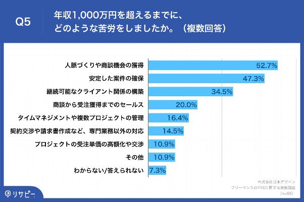 年収1,000万円を超えるまでの苦労として、最も多くの人々が挙げたのは「人脈づくりや商談機会の獲得」で、52.7%の回答があった。また、「安定した案件の確保」が47.3%、「継続可能なクライアント関係の構築」が34.5%と続く。フリーランスとしての成功のためには、人脈の構築や安定した案件の獲得が不可欠であることがわかる。