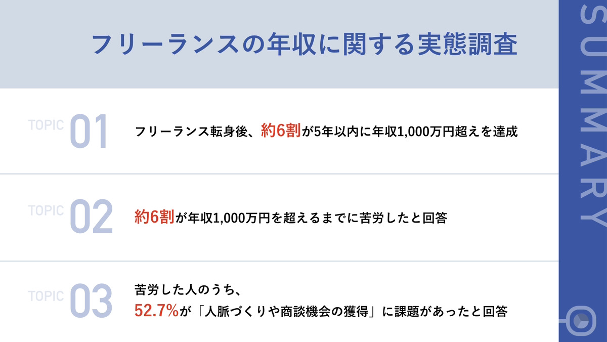 フリーランスとしての活動は、多くの人々にとって魅力的な選択肢となっている。自由な働き方、特定の場所や時間に縛られない柔軟性、そして独自の専門性やスキルを最大限に活かすことができるためである。しかし、実際にフリーランスとしてどれだけの収入を得ることができるのか、その実態はあまり知られていなかった。今回の調査は、そうした背景から実施されたもので、フリーランスとしての収入の実情や、高収入を得るためのポイントを明らかにすることを目的としている。