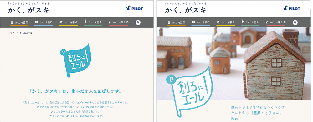 「かく、がスキ」では、「かく(書く・描く)」という表現に注目し、手書きの楽しさや喜びを伝えるような情報を発信している。新たにオープンした「創るにエール!」は、創作活動に力を注ぐクリエイターを募り、その人柄や作品を紹介する内容だ。