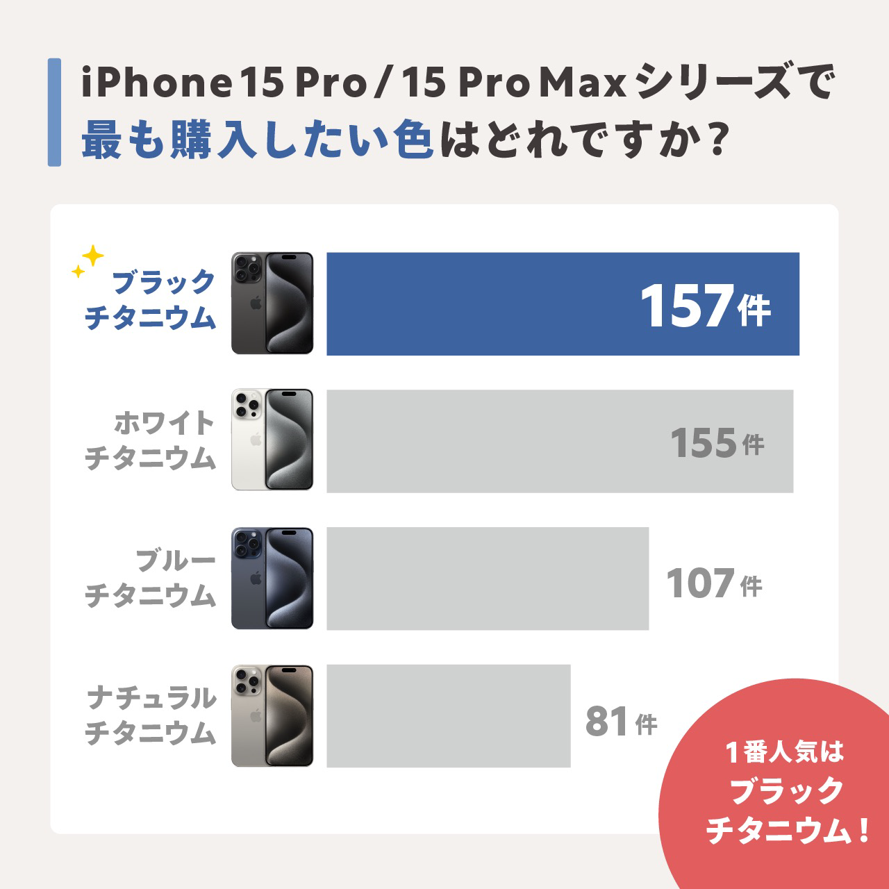 調査では、iPhone 15/15 PlusシリーズとiPhone 15 Pro/15 Pro Maxシリーズで最も人気のあるカラーについても明らかにされた。iPhone 15/15 Plusシリーズでは、207票を集めた「ブラック」が1位となり、2位の「ブルー」に比べて約2倍の差をつける圧倒的なトップとなった。一方、iPhone 15 Pro/15 Pro Maxシリーズでは、「ブラックチタニウム」が最も人気で、2位の「ホワイトチタニウム」とはわずか2票差であった。この結果を見ると、iPhone 15/15 Plusシリーズに比べ、Proシリーズの人気カラーには偏りが少ないことがわかる。
