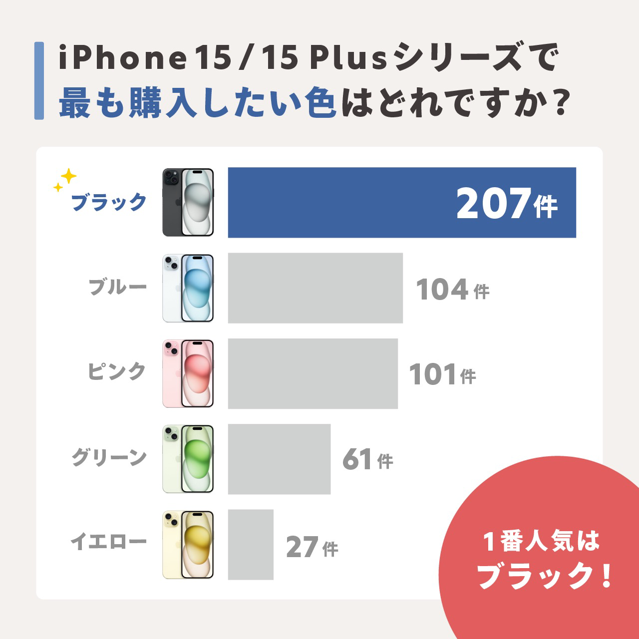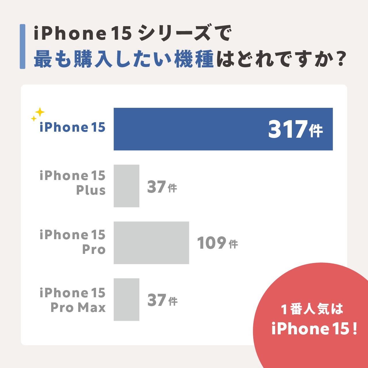 また、iPhone 15シリーズで最も人気のあった機種は「iPhone 15」で、317人(全体の63.4%)がこの機種を「最も購入したい機種」と回答している。次に人気のあったのは「iPhone 15 Pro」で、109人(全体の21.8%)が選んだ。価格の高さにも関わらず、Proシリーズは多くの人々から支持を受けていることがわかる。