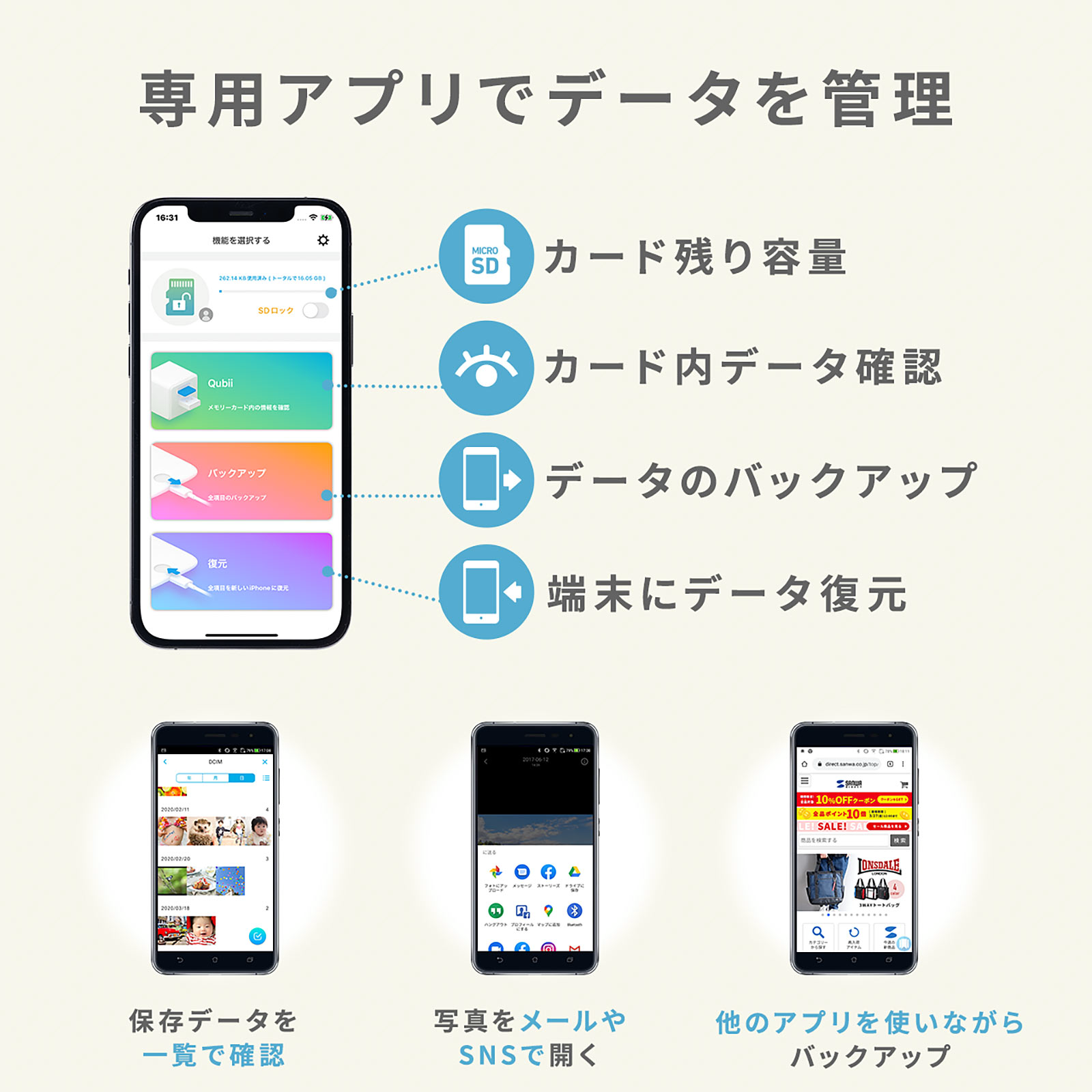 専用アプリ「Qubii Pro」を使用することで、接続するだけでデータが自動でバックアップされ、他のアプリを起動しながら使用できる。今回Type-Cポートを採用したアイテムが新たに登場するので、選択肢が増え、より多くの人にとって使いやすいアイテムとなった。