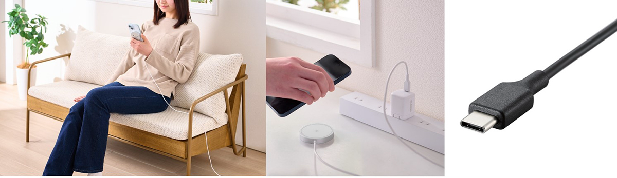 ワイヤレス充電器の本体に一体化されたケーブルは、余裕のある約1.5mの長さです。コネクタはUSB Type-C形状で、Type-Cポートを搭載したAC充電器などからの充電ができます。AC充電器は本製品には含まれないため、USB PD 20W以上に対応したものを別途に自前で用意することが必要です。