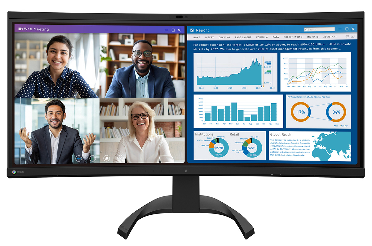 「EV3450XC」は、同社のビジネス向けモニター「FlexScan」シリーズの新製品です。34.1型モデルでUWQHD(3,440×1,440)解像度に対応しています。アスペクト比が21:9で、Web会議の画面と資料を並べるなど、複数のウィンドウを配置して作業しやすい横長の大画面モデルです。