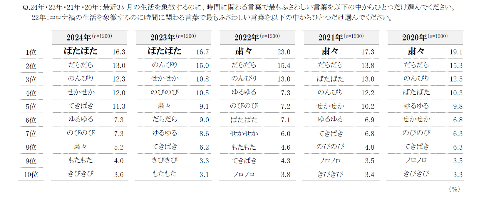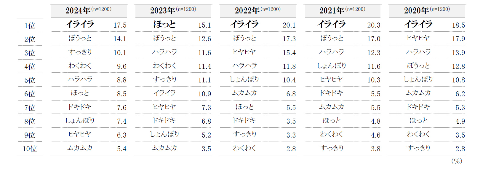 「最近の生活を象徴するのにふさわしい言葉」を答えてもらう質問では、2023年と同じく「ばたばた」が1位となりました。コロナ禍からの規制緩和をきっかけに「ばたばた」と忙しさを感じる人は増えているようです。また、最近の生活を象徴する心情にまつわる言葉の1位は「イライラ」で17.5%でした。