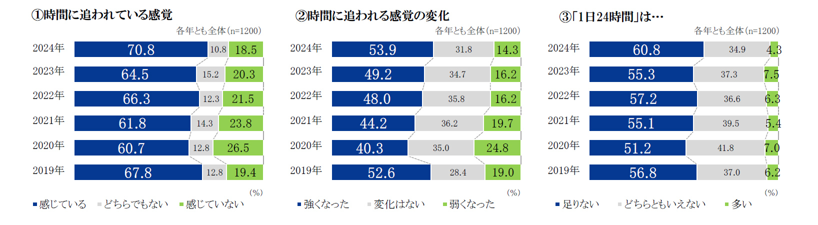 「定点観測」として毎年実施されている設問では、普段の時間の感覚として「時間に追われていると感じる」という答えが2023年から6.3pt増え、70.8%にも達しました。「1日24時間では足りない」と感じる人が60.8%もいます。