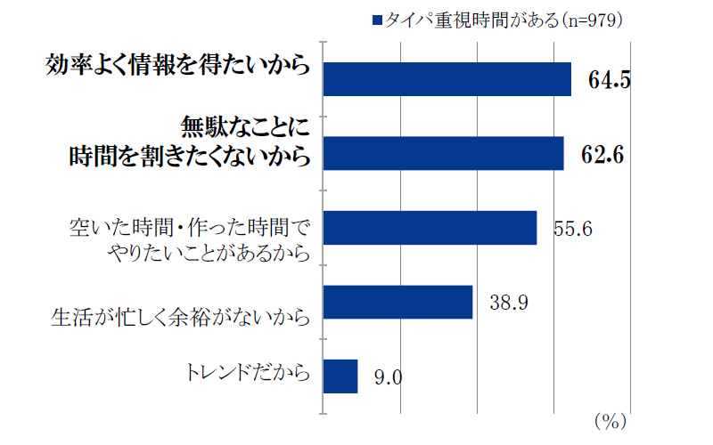 「タイパ」を重視する理由については、「効率よく情報を得たいから」(64.5%)、「無駄なことに時間を割きたくないから」(62.6%)、「空いた時間・作った時間でやりたいことがあるから」(55.6%)といった答えが上位に並びました。