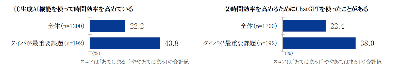 もう1つ、クリエイターも注目の面白い内容が、「タイパ」とAIの関係性についての調査です。「時間効率を高めるために意識していること」に関して、「生成AI機能を使って時間効率を高めている」「時間効率を高めるためにChatGPTを使ったことがある」と答えた人は、全体の中でも「タイパが最重要課題」と考える人たちに特に多いことが分かりました。