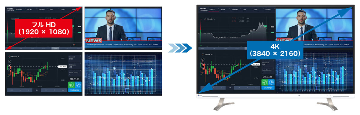 「EV4340X」は、4K UHD(3,840×2,160)解像度に対応する大画面モニターです。主にプログラミングや金融機関の業務など、膨大な情報を一覧表示したいユーザーの使用が想定されています。42.5型は、従来の37.5型のモデルを超えて「FlexScan」シリーズで最大のサイズです。大画面でありながらもスリムな筐体が実現されており、標準的なオフィスのデスクに設置できます。