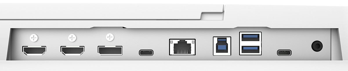 映像用の入力インターフェイスは、USB Type-C、DisplayPort、HDMI×2で、3ポートのUSBハブ機能やUSB LANアダプタ機能も搭載されています。Type-Cケーブルであれば、ノートパソコンとケーブル1本で繋ぐだけで、画面表示/音声再生/パソコンへの94Wの給電などをまかなえて構成がシンプルです。