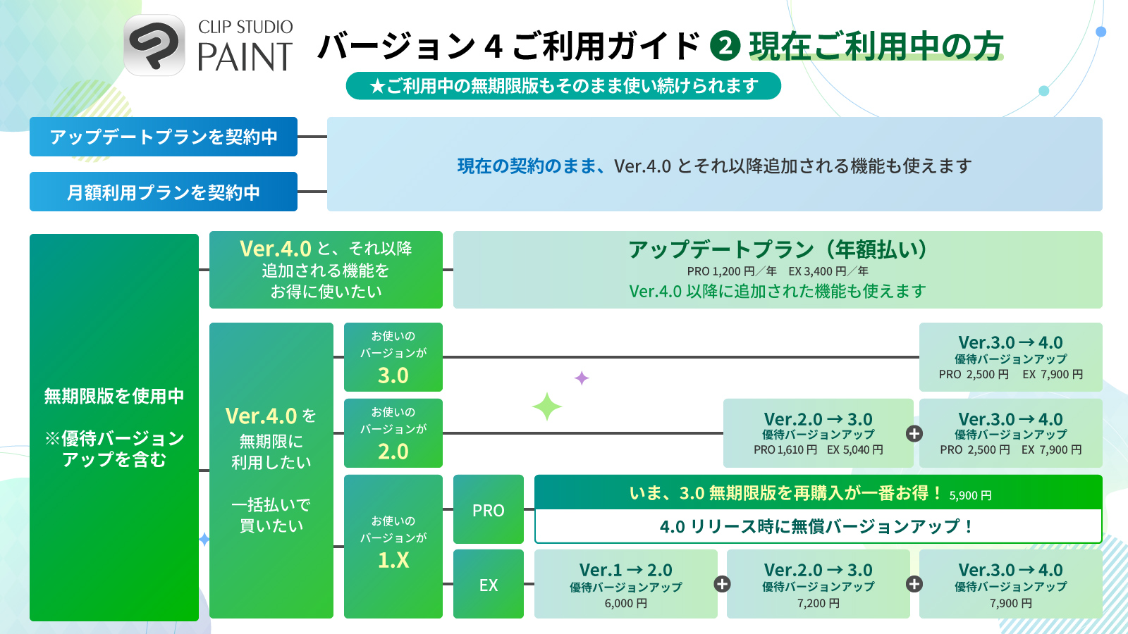 株式会社セルシスのペイントソフト「CLIP STUDIO PAINT」が、2025年3月にVer.4.0へとメジャーバージョンアップします。価格改定も予定されており、Ver.3.0の無期限版を購入するとVer.4.0がもらえるキャンペーンを2024年12月末まで実施中です。