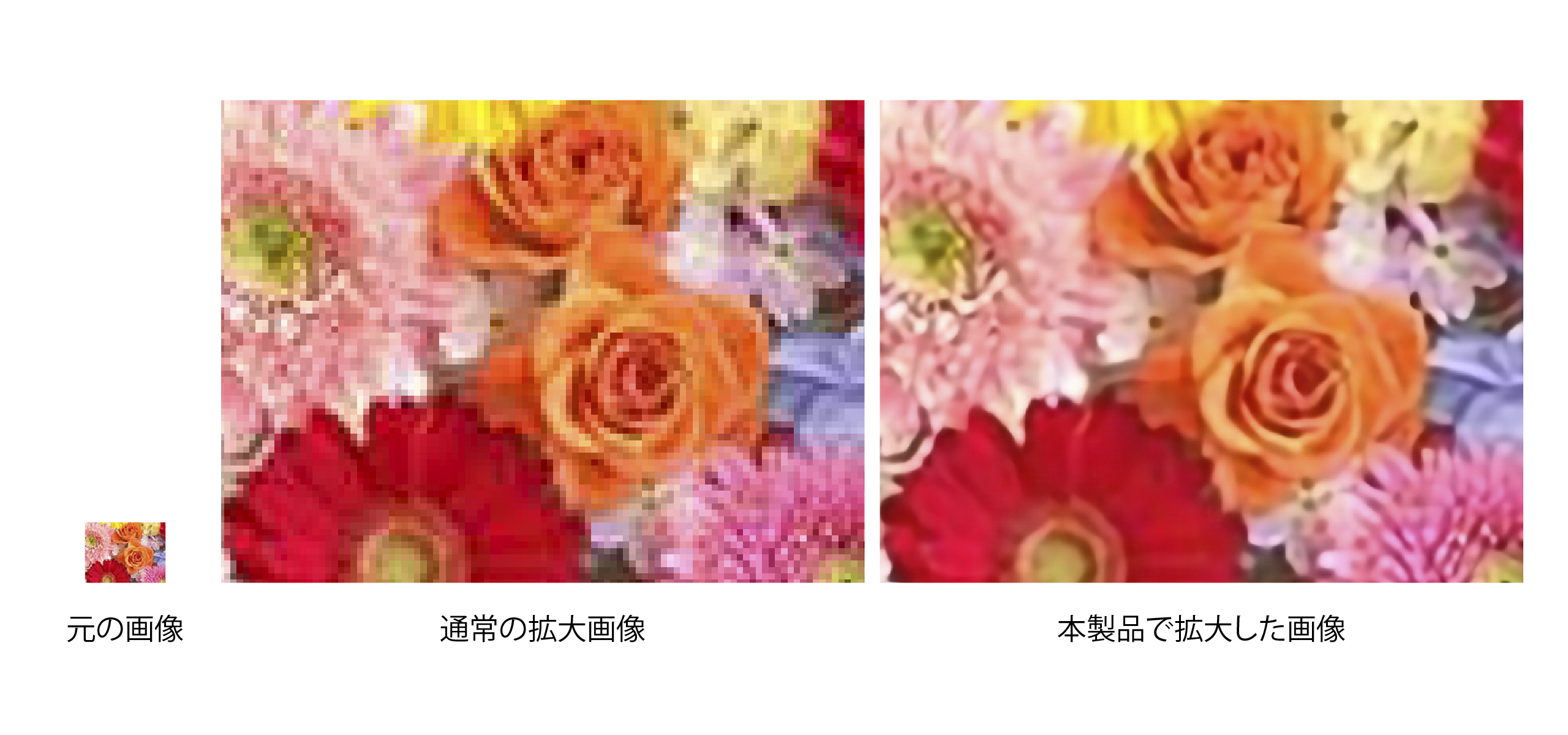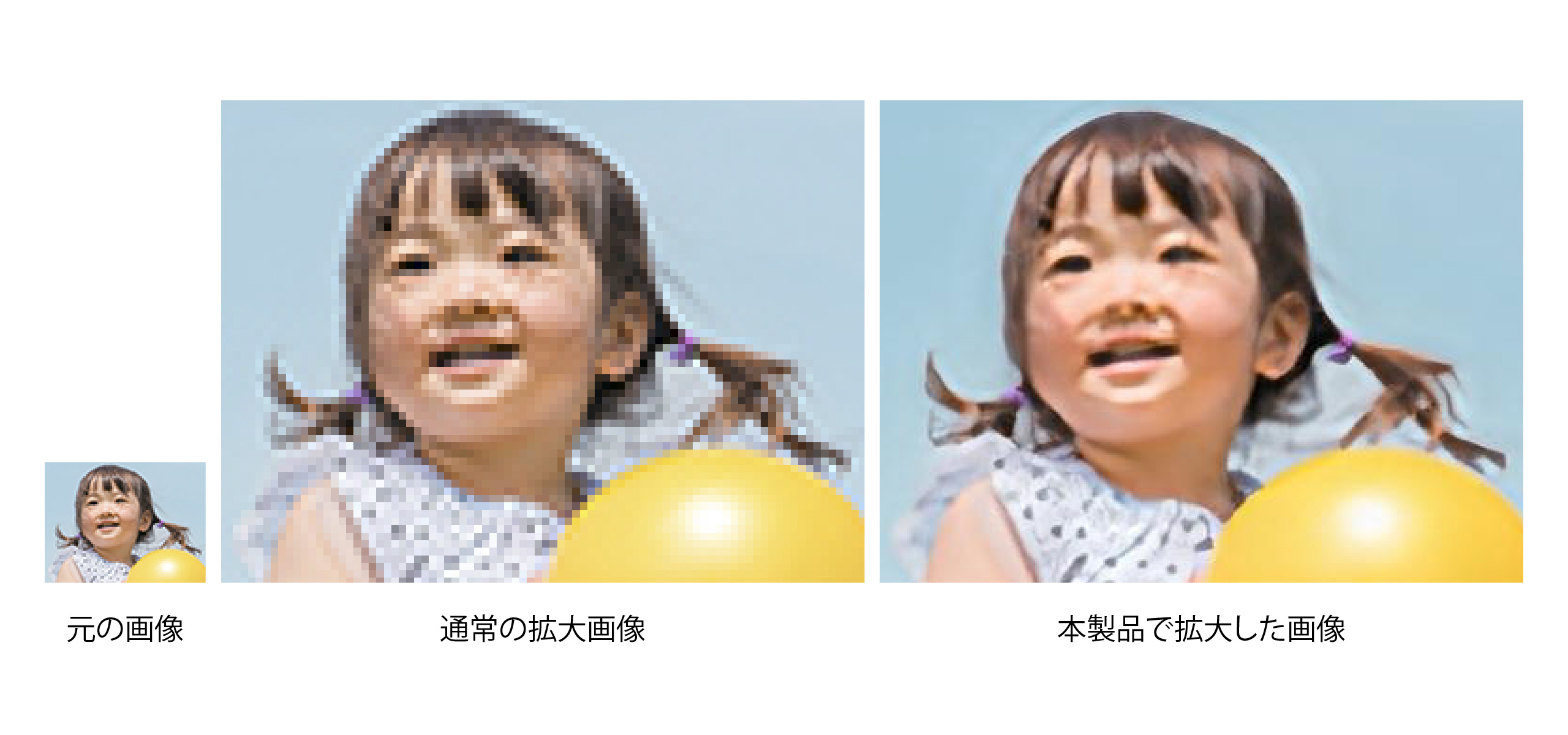 本ソフトでは、画像の拡大化と鮮明化が同時に実行されます。通常は画像を拡大するとぼやけたり粗くなったりしますが、そのような劣化を抑えつつアップスケールできます。