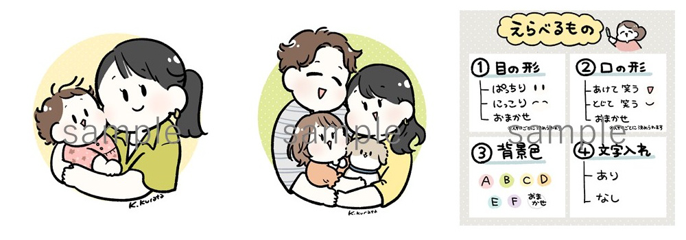 漫画家・イラストレーターの倉田けい氏も、写真をもとに家族のイラスト作品を制作する「もっちり抱っこ似顔絵」サービスを提供しています。価格の例として、2人用のパターンは17,000円(税込)、4人用のパターンは23,000円(税込)です。