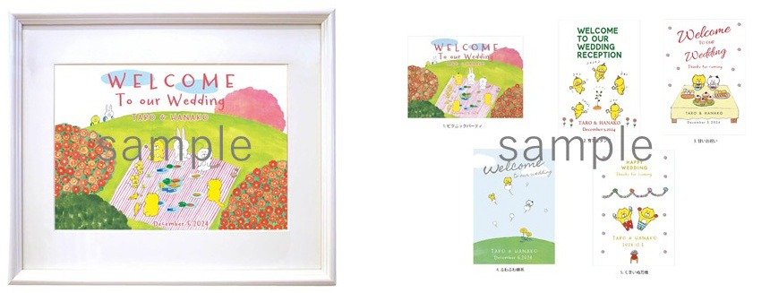 イラストレーターの今井杏氏は、希望のイラストを使ってウェルカムボードを制作し、額装して納品するサービスを展開しています。価格は28,000円(税込)で、依頼者は作品に描かれるテキスト部分の指定が可能です。
