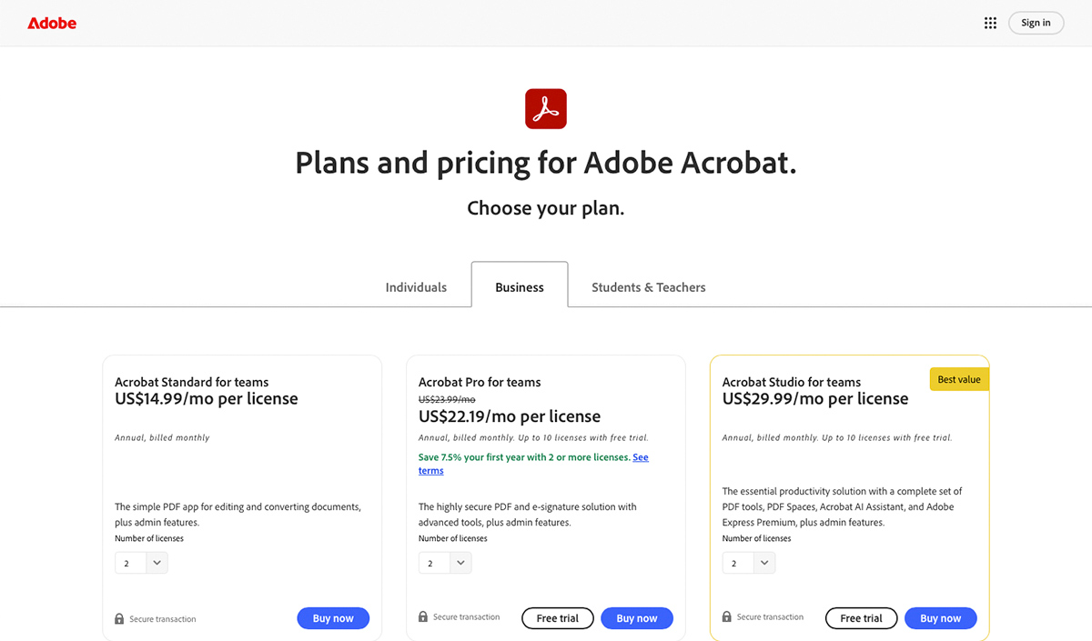 「Acrobat Studio」は、世界各国で既に英語版の提供が開始されており、個人向けとチーム向けの両方のプランがあります。個人向けは年間契約で月額約24.99ドル、チーム向けは1ラインセンスあたり月額約29.99ドルから利用が可能です。なお、この料金体系は2025年8月時点の早期アクセス価格で、2025年10月31日(金)までのものとなります。初回導入時には7日間の無料トライアルもあり、その後14日以内にキャンセルすれば全額返金される仕様です。