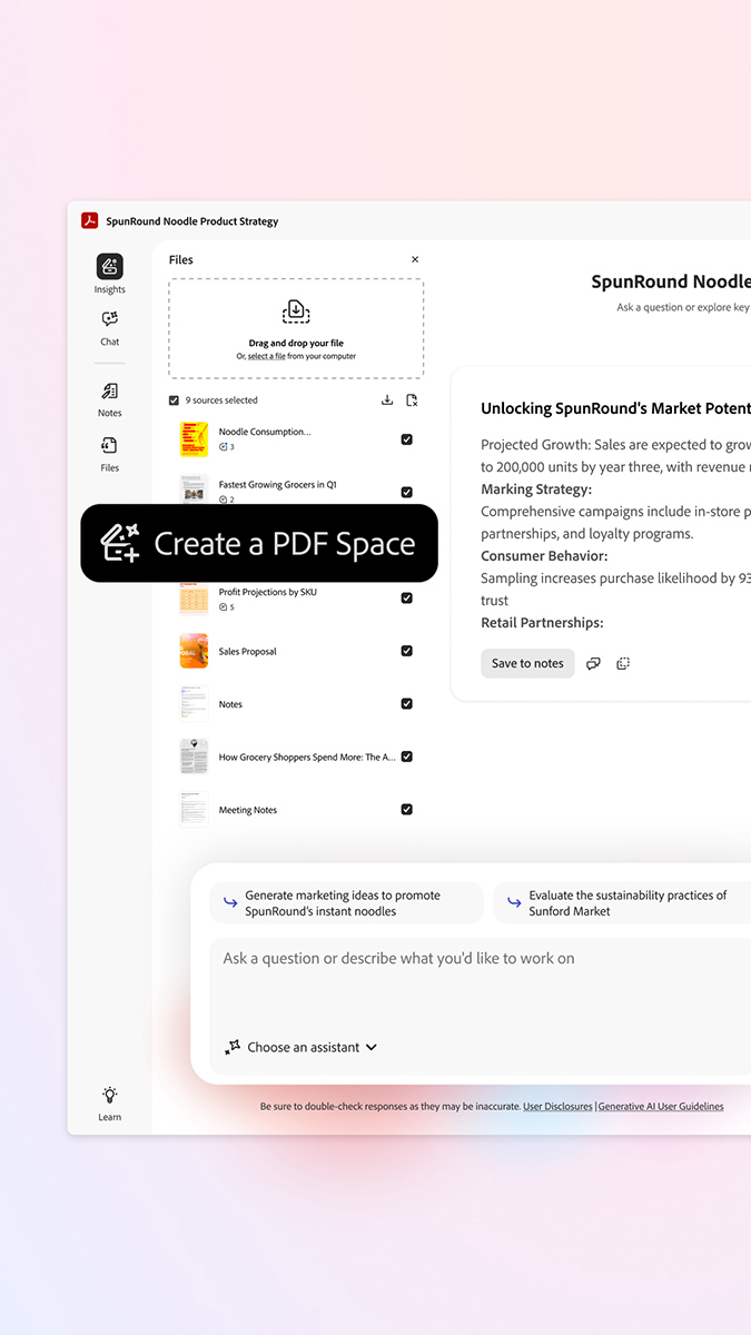 「PDF Spaces」では、AIアシスタントと対話しながらPDFやWebコンテンツの編集/要約/翻訳などを進めることが可能です。複数人での共同作業にも対応しており、必要なファイルやコメントを1カ所に集約できます。
