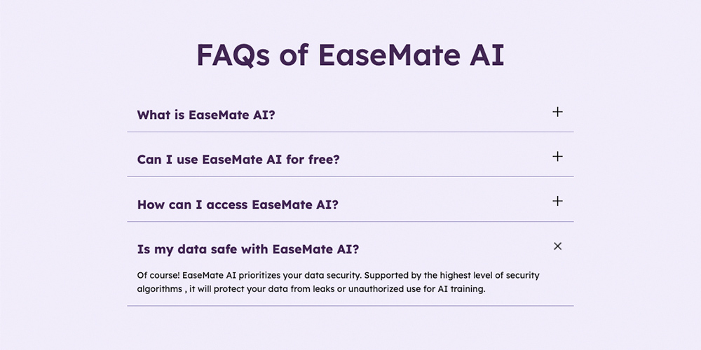 なお、AIサービスを利用する際には、セキュリティ面も気になるところです。「EaseMate AI」ではセキュリティが最優先に考えられており、高いレベルのセキュリティアルゴリズムによって、データ漏洩やAI学習のための無断使用からの保護が行われていることが紹介されています。とはいえ、AIサービス全般に言えることですが、万全を期して個人情報や重要な機密情報などは入力しないように注意しながら活用すると良いでしょう。