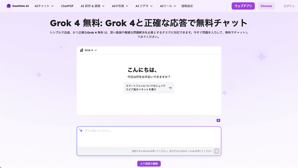 そこで今回は、複数の生成AIを横断的に使うことができる無料の「EaseMate AI」を紹介していきます。テキストや画像生成を1つのプラットフォームで完結でき、気軽にAIの魅力を体験できる注目のサービスです。現在は「EaseMate AI」からログイン不要で「Grok 4 Free」を使うことができます。