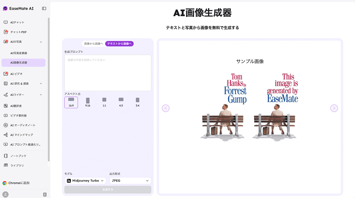 たとえば「AI Image Generator」では、「Image to Image(画像から画像へ)」と「Text to Image(テキストから画像へ)」という2つの項目があり、一般的な画像生成AIと同じような操作感で画像を生成できます。画像の生成結果はAIモデルによって大きく変わりますが、「EaseMate AI」は1つの画面でさまざまなAIモデルを試せるところが便利です。