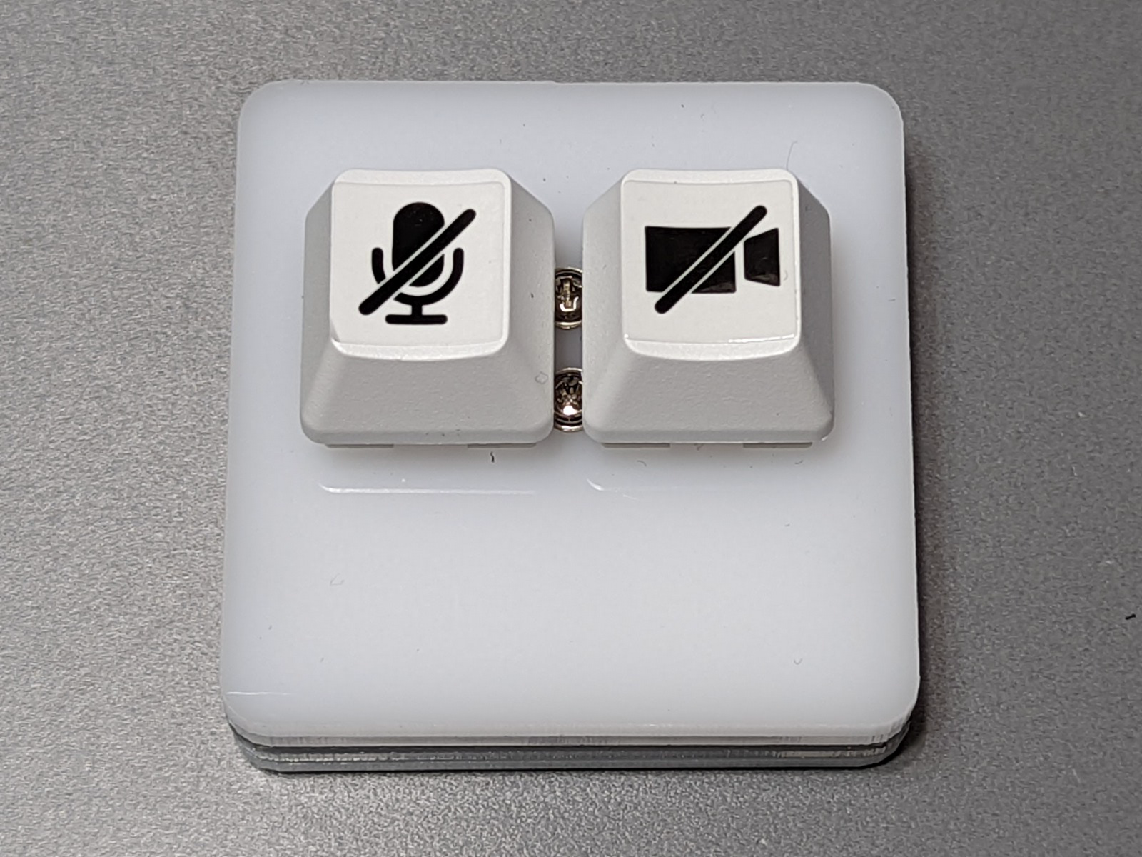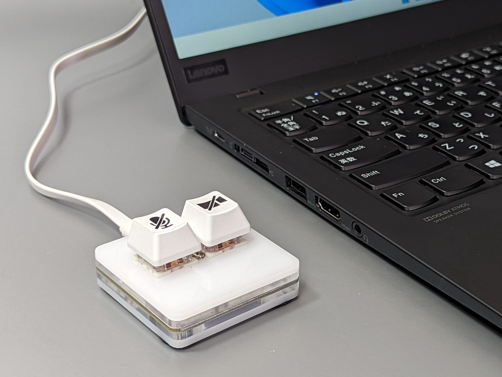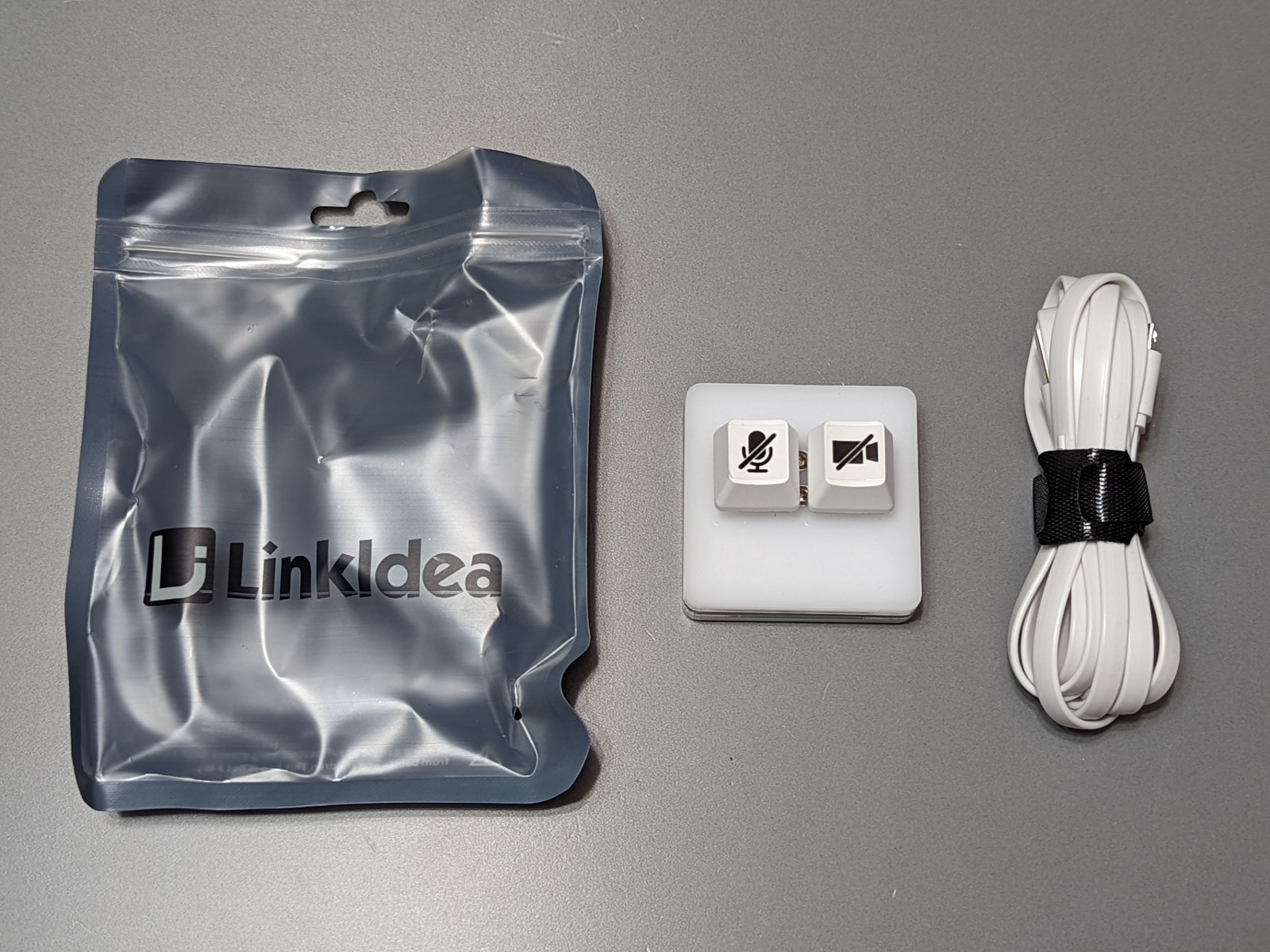 ほぼ正方形の本体には、2つのメカニカルキーが搭載されており、それぞれを押すことによって、カメラとマイクそれぞれのオンとオフが行えます。これをUSBでPCに接続しておくことで、面倒だったカメラとマイクのオン・オフが、物理ボタンで行えるようになるというわけです。