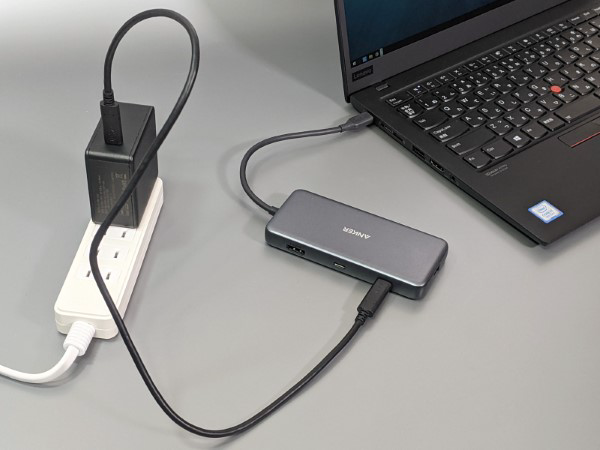 USB Type-Cポートの一方は、急速充電規格であるUSB PDに対応しており、ここにUSB PD対応の充電器を接続することで、本製品経由でノートPCの充電が行えます。