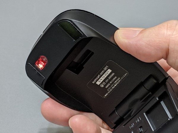 唯一のネックは、この太陽電池パネル面が、手のひらで覆ってしまう位置にあるため、利用しながらの充電には対応しないことです。マウスは一般的に、使用中は本体上面をほぼ完全に被ってしまうので、当然といえば当然なのですが、ちょっとした盲点と言えます。