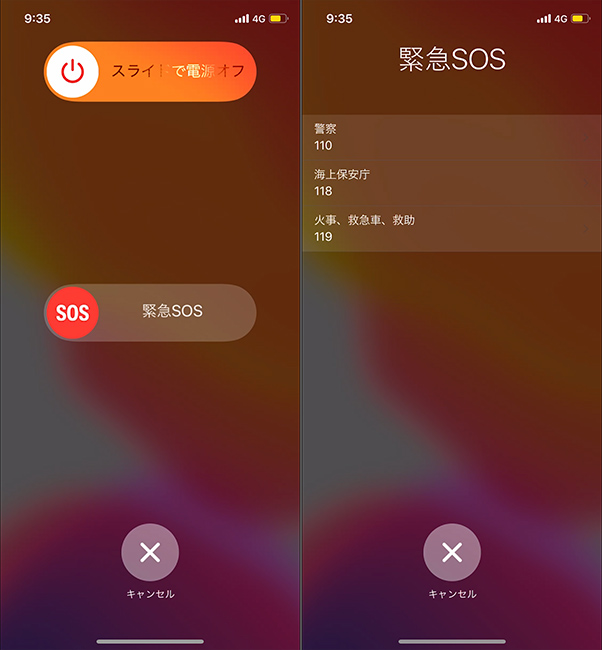 かじがや 突然倒れたり、身の危機を感じたりしたときに、iPhoneを使って助けを呼ぶ方法もあります。iPhone 8以降は両サイドのボタン(音量ボタンはどちらでもOK)を同時に長押し(そのほかのiPhoneはサイドボタンまたはスリーブボタンを5回クリック)すると、画面に「緊急SOS」のスライダーが出てくるのでドラッグ(画像左)。そうすると、「警察110」「海上保安庁118」「火事、救急車、救急119」の選択項目が出てくるので、該当するものを選んでください(画像右)。もしくは、「緊急SOS」のスライダーが出たら、さらに両ボタンを長押し、自動的に緊急通報用電話番号にかけるという方法もあります。