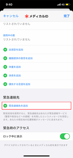 自分に何かあって意思表示ができない様な場合に、応急手当にあたってくれる人がパスコードを入力せずとも、患者の重要な医療情報を知ることができ、素早い処置につながります。いわば、iPhoneに内蔵された“電子カルテ”といった感じ。登録の仕方は以下の通りです。