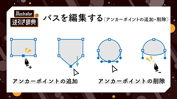 Illustrator(イラレ)で、アンカーポイントの追加や削除を行なってパスを編集する方法・手順・仕組みを解説します。作成した図形や文字を後から修正したいときに利用するIllustratorの基本操作の一つです。