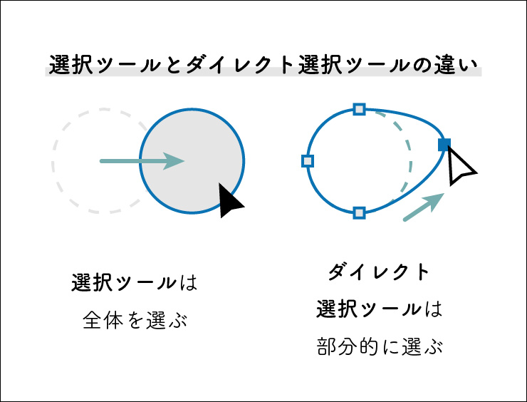 「選択ツール」と混同する可能性の高いツールですが、違いは、全体を選択するのが「選択ツール」、部分的に選択するのが「ダイレクト選択ツール」です(図2)。