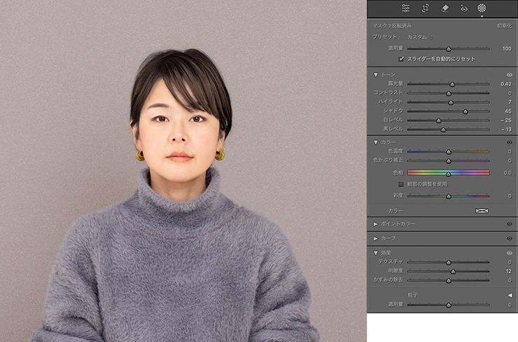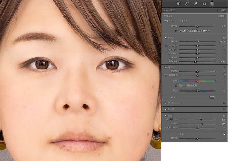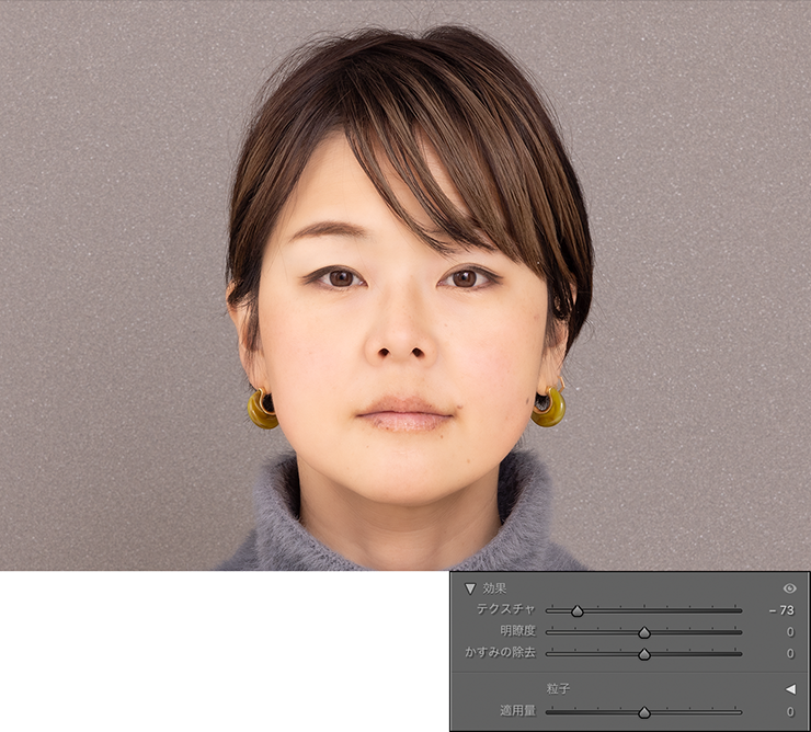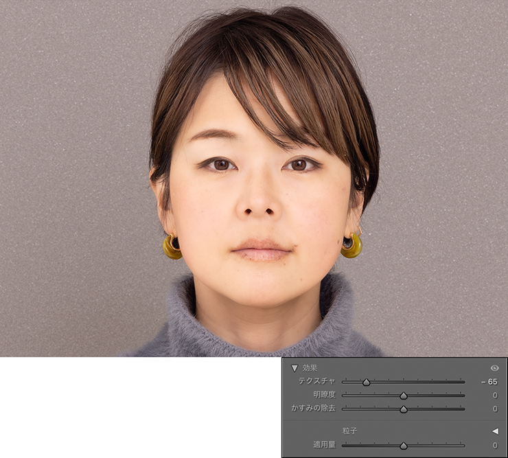 ただ、もう少し肌の質感は残したいと思ったので、ここでは[テクスチャ:ー65]に調整しておきました(図18)。