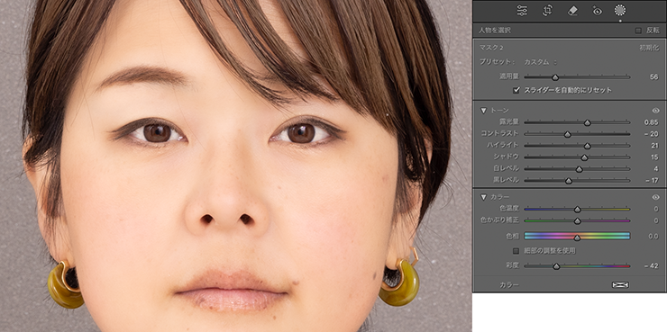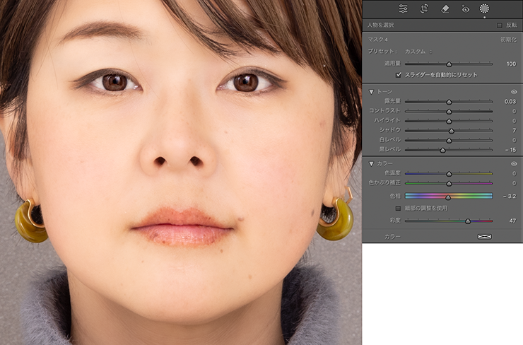 以上、Lightroomでマスクツールを使って人物の補正を行う方法でした。