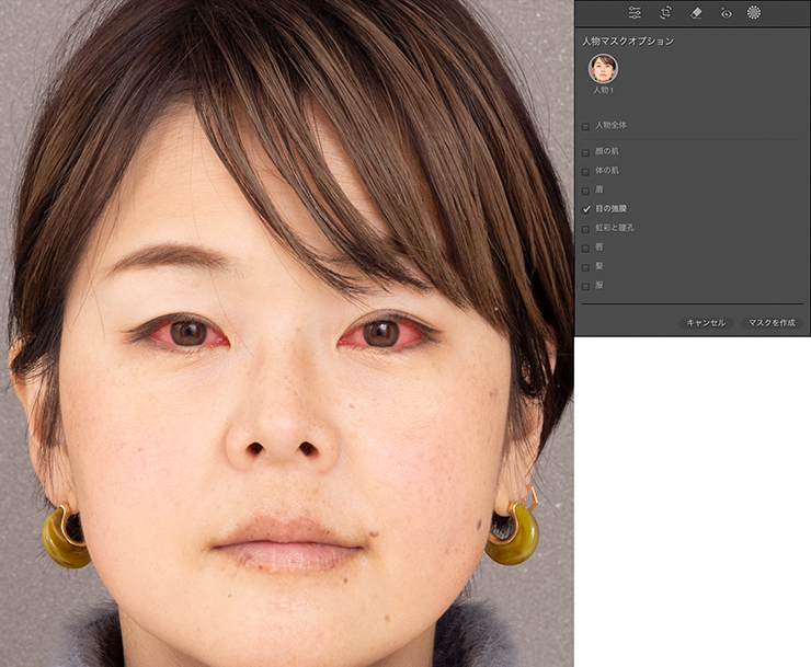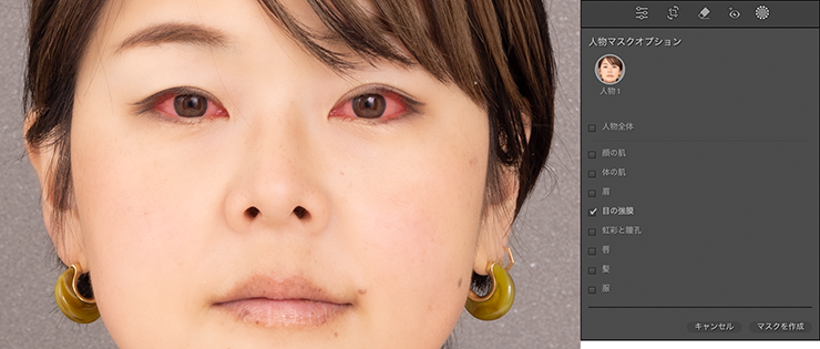 続いて調整したい人物(ここでは[人物1])をクリックし、[人物マスクオプション]で調整したい部分(ここでは[目の強膜])を選んで[マスクを作成]をクリックします(図20)。
