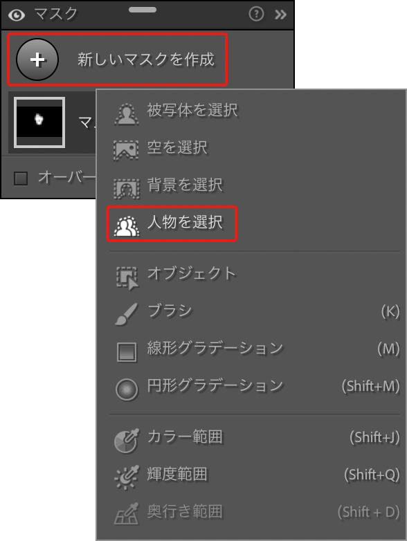 肌を調整したあとで別の部分を調整したいときは、マスクパネルの[新しいマスクを作成]をクリックして、サブメニューから“人物を選択”を選びます(図19)。