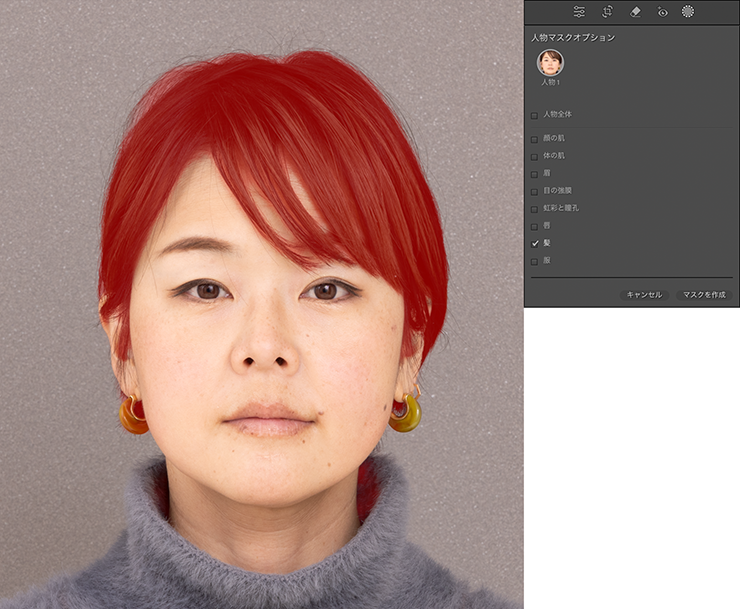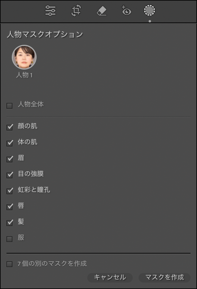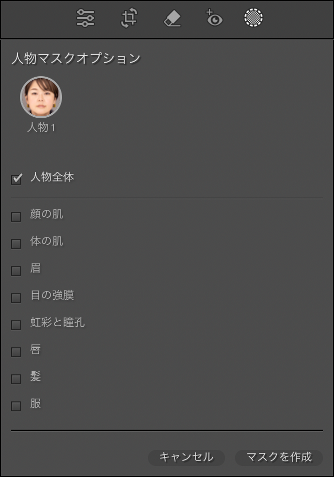 [人物マスクオプション]には、複数の選択項目があり、それぞれチェックボックスにチェックを入れて[マスクを作成]ボタンをクリックすることで部分的にマスクを作成することが可能です。