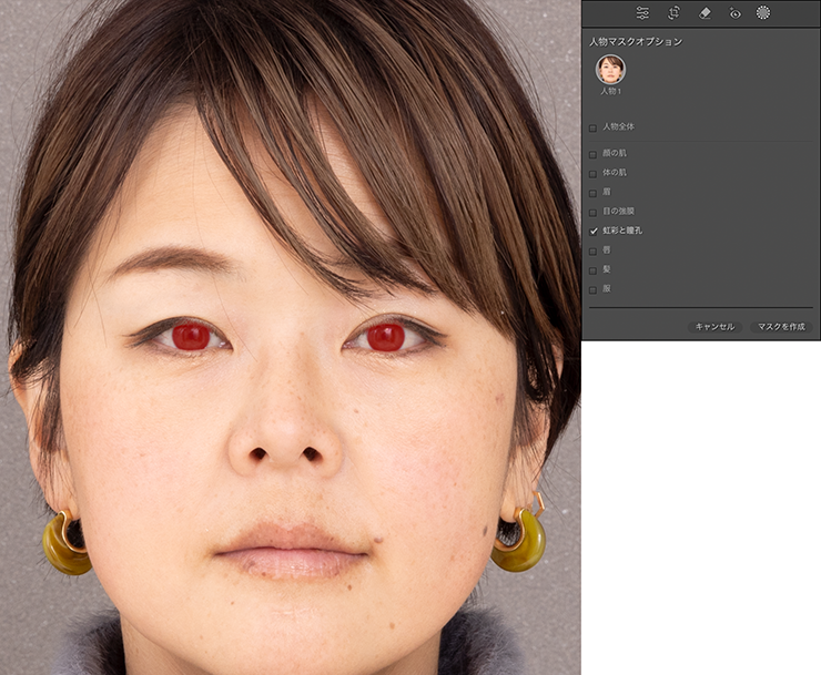同様にマスクパネルの[新しいマスクを作成]から“人物を選択”を選び、[人物マスクオプション]の[虹彩と瞳孔]にチェックを入れてマスクを作成し、黒目や茶目を調整します。白目の場合と違って、明るさを調整するというよりは[効果]パネルにある[テクスチャ]や[明瞭度]を調整することで、うるっとしたきれいな目にするのがポイントです(図24)。