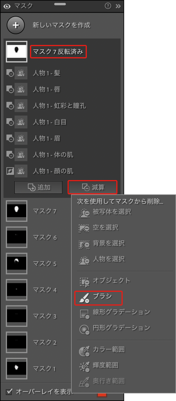 そこで、マスクパネルで先ほど反転したマスクの名前(ここでは[マスク7反転済み])をクリックしたあと、パネル下部にある[減算]を選択して“ブラシ”を選びます(図39)。