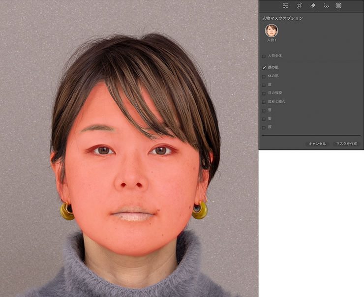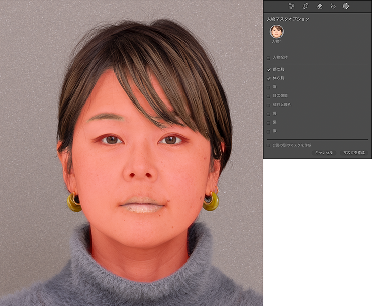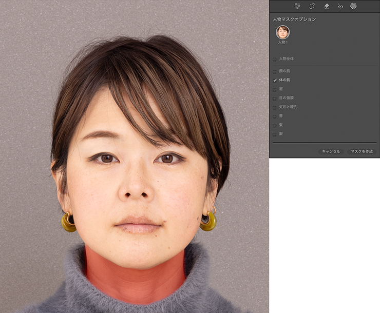 ここでは、[顔の肌]と[体の肌]にチェックを入れたあと[マスクを作成]をクリックして、肌部分のみを調整できるようにしました。それでは実際にマスクを利用して肌をきれいにしていきましょう。