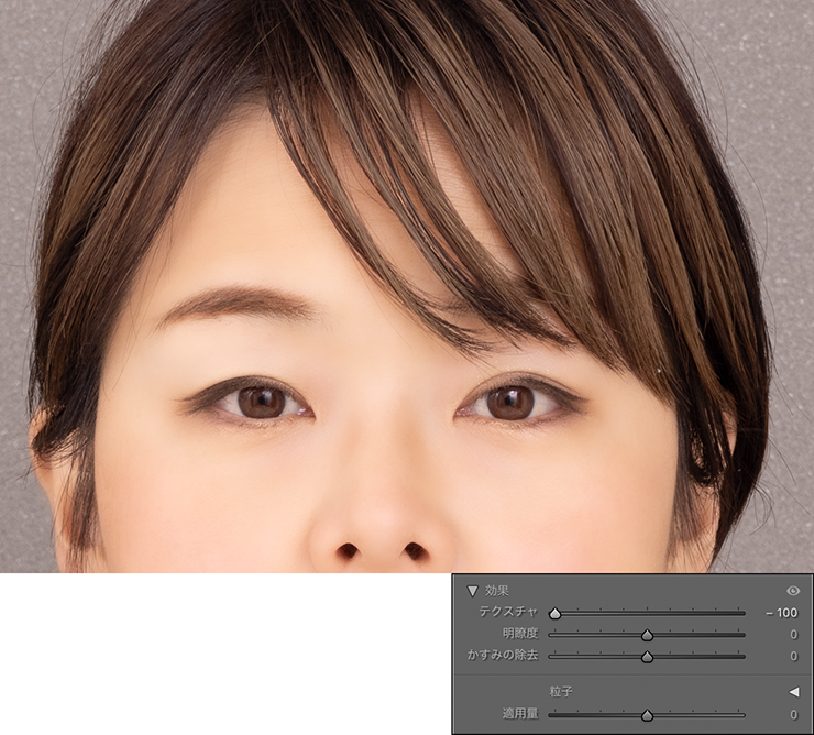 [テクスチャ]のスライダーをいちばん左まで動かしてみました。目元や眉毛などは元のまま、肌の部分だけきれいにぼけています(図17)。