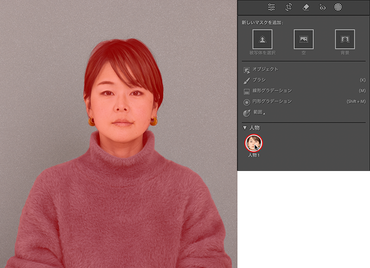 [マスク]ツールを選択すると、パネルの下の方にある[人物]の欄に少しの間[人物を検出中...]と出たあと[人物1]と表示されます。その上にマウスポインターを合わせると、写真の人物部分に半透明の赤が重なって(オーバーレイ表示されて)見えるはず(図3)。Lightroomは、写真に写っている人物をAIで自動的に検出してマスクを作成してくれるんです。今回はひとりだけですが、写真内に複数の人が写っている場合は、[人物1]、[人物2]……という具合に個別に選択できます。便利ですよね。