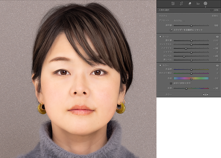 再びツールストリップの[マスク]ツールを選択したあと、マスクパネルの[新しいマスクを作成]から“人物を選択”を選び、[人物マスクオプション]の[髪]にチェックを入れてマスクを作成し(図30)、髪色を整えます。ここでは、[ハイライト]や[白レベル]を抑え、[彩度]を落として調整しました(図31)。筆者の場合、たまに人材採用ページなどに使う写真で「髪の毛の色を落ち着いたトーンにしてほしい」と言われることがあるのですが、そんなときにこのマスクは便利だなと思います。